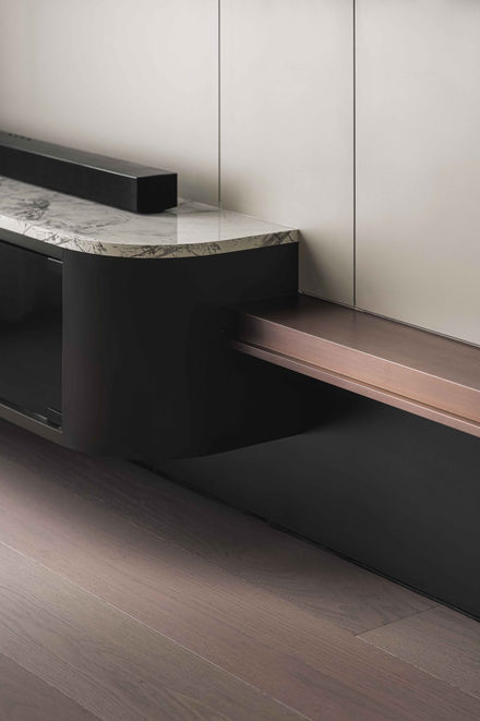 弧線刻劃客廳暗門與電視牆形成一個整體,