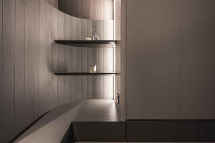 設計師將自然石紋理與條子造成弧形排序透出光與影,